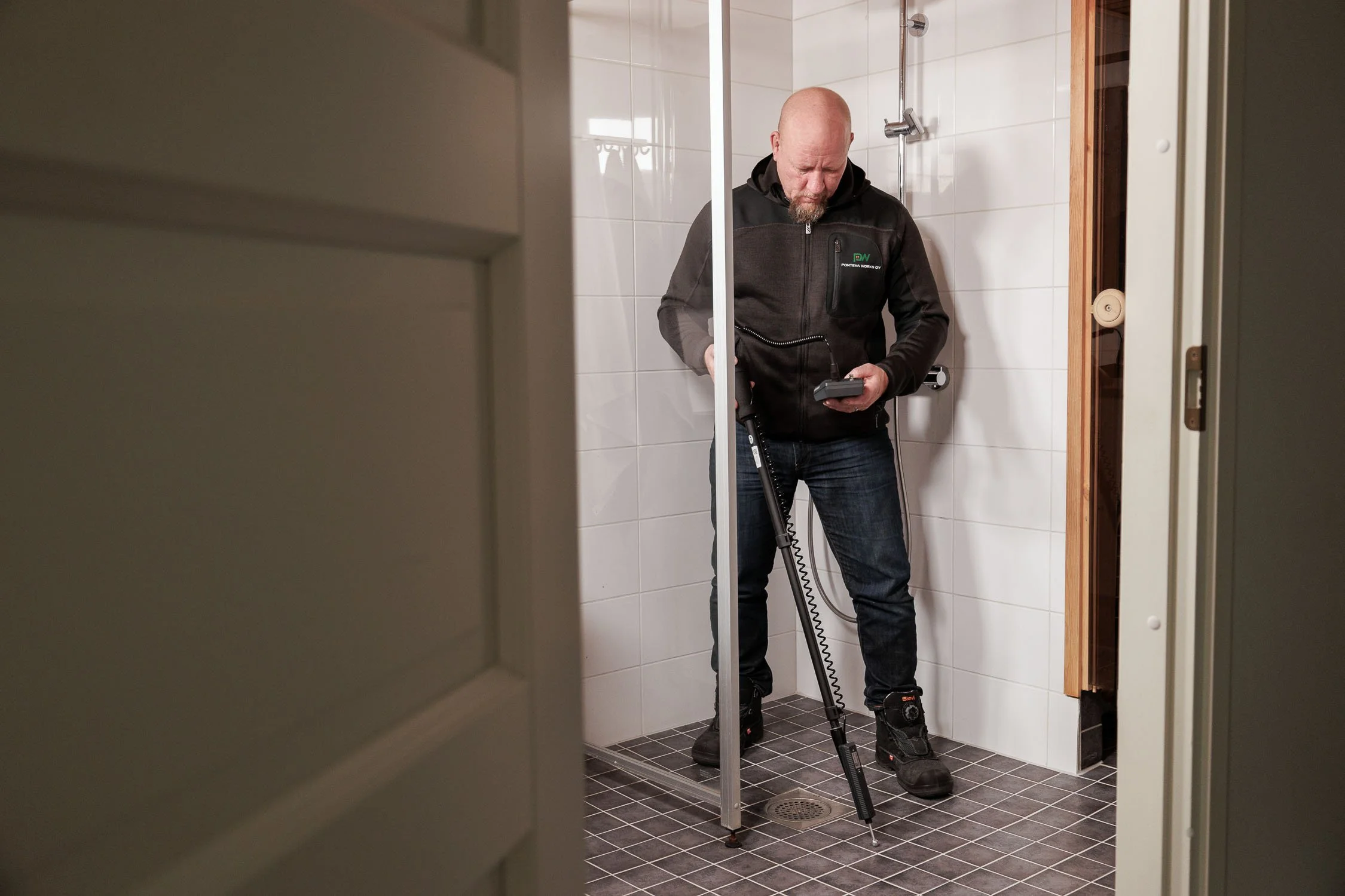 Ponteva Works Henri tekemässä kosteuskartoitusta kylpyhuoneessa.